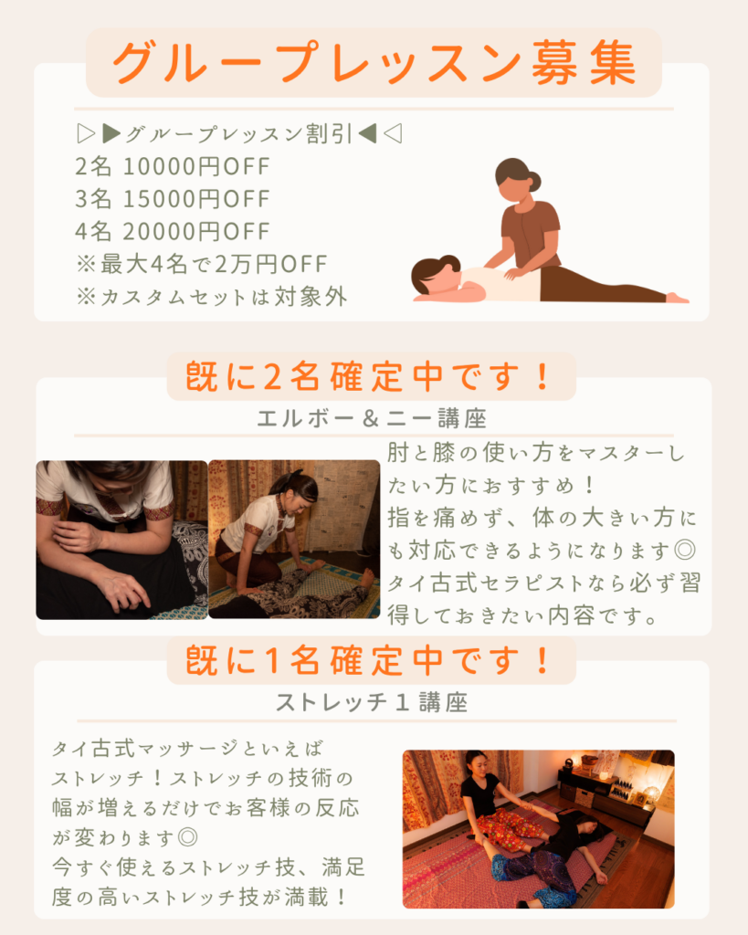 バリニーズ・タイ古式スクール/日本BTHセラピスト協会(埼玉・大宮)では、下記2講座のグループレッスン募集を開始します。